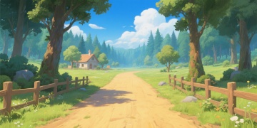 插画风的虚拟自然景观,清新舒适,小径通向森林深处的小屋,营造宁静氛围。