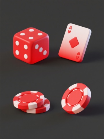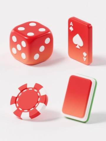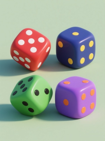 俯视角木质桌面,散落着日常用品,包括棕色线圈笔记本、蓝色和红色回形针、白色骰子、几张扑克牌、绿色盆栽、白色咖啡杯装着黑色咖啡,整体呈现3D卡通风格,色彩明亮鲜艳,细节丰富,物体边缘圆润可爱,光线柔和均匀