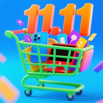 卡通感3D微缩艺术风,塑料质感购物车满载科技产品,搭配波普色彩与“11.11”字样,营造未来感双11促销氛围。