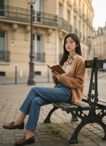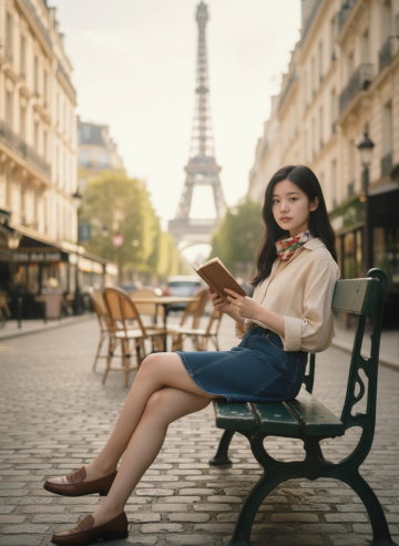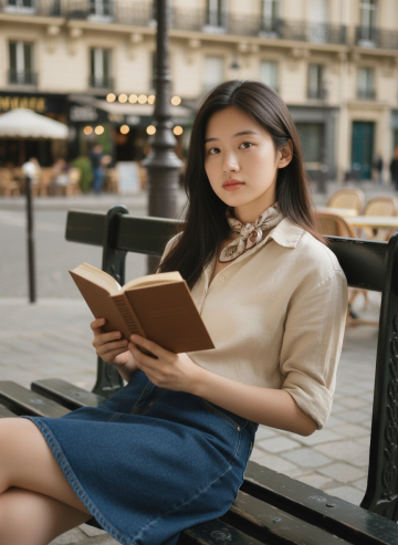 文艺感与复古风交织,少女在巴黎街角静读,胶片质感光影柔和,杂志风构图优雅清新,东亚美学融入实景氛围,时尚与舒适并存。
