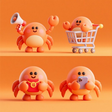软3D风格的拟人螃蟹,萌趣十足,手持喇叭、购物车、红包与手机,充满卡通感与喜庆氛围,传递节日欢乐。