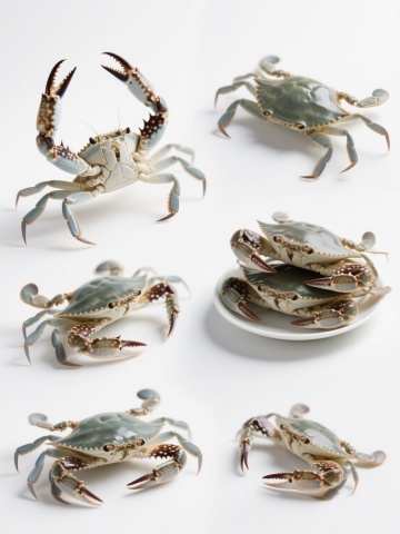 一组6个不同造型与角度的生鲜梭子蟹系列素材,每个螃蟹保持真实细腻的写实风格,呈现出青灰色带光泽的甲壳、棕褐色斑纹的螯足、尖锐的蟹钳与细密的腿毛等细节,采用纯白色纯色背景,整体光影柔和自然,阴影清晰。6个螃蟹造型包括:左侧单只举起双螯的正面特写、右侧单只侧身爬行姿态、俯视角完整展示甲壳纹理的单只、仰视角凸显腹部结构的单只、整盘3只堆叠呈不同朝向的组合、以及单只蟹钳张开的局部特写,所有素材规整排布在同一画面中,形成风格统一、元素相同但形态各异的系列集合。