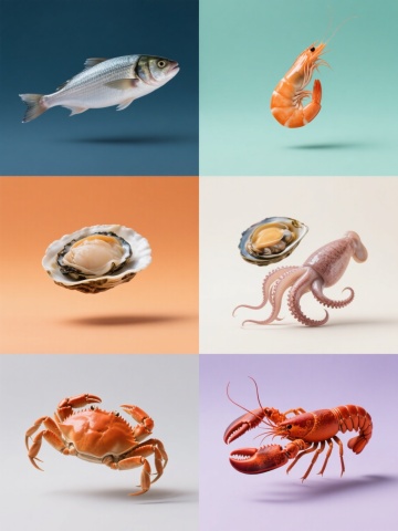 一组六张具有高写实主义风格的系列素材,每张展示一种不同的新鲜水产,包括鱼、虾、蟹、贝类、鱿鱼和龙虾,保持与原图一致的精细纹理表现、清晰的轮廓边缘、自然的光影过渡和悬浮姿态,每张素材采用不同的纯色背景(如深蓝、浅灰、薄荷绿、暖橙、米白、淡紫),整体画面色彩明快且统一,所有元素类目规整排布,形成协调的视觉系列。