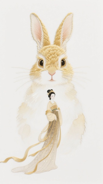 一个巨大的兔子眼睛看着下方的嫦娥(全身),烟雾遮挡露出朦胧的兔头,兔子眼睛有星光效果,浑身金色发光拉丝效果,光细腻如发丝,大面积留白,概念视觉,朦胧,梦幻,对称构图,极致的大小对比,金色调
