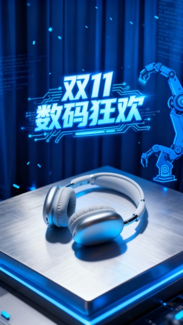 赛博朋克风3D设计,霓虹蓝光勾勒“双11数码狂欢”,金属质感耳机与机械臂呼应科技感,光影交错展现未来酷炫氛围。