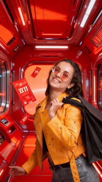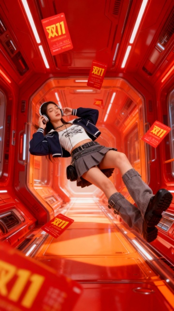 一张促销海报。高科技的红色太空车厢内部设计充满科技感(远景),图片中的人物侧躺着漂浮,戴着头戴式耳机,享受音乐,四周漂浮着很多红色的劵,上面写着黄色的“双11”。整个画面色调以红色为主,橙色为辅,搭配金属质感与光影效果。