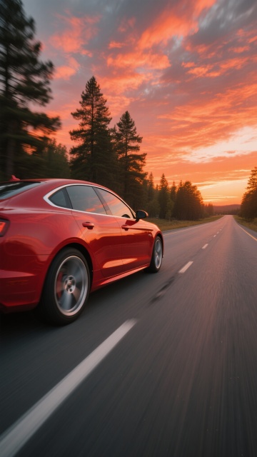 一辆红色轿车在开阔的公路上行驶,车轮带有动态模糊效果,背景是壮丽的日落天空,橙红色的云彩铺满天际,道路两旁有高大的松树,整体画面呈现出写实摄影风格,光线温暖,色彩浓郁,营造出一种自由、动感且充满力量的氛围,车辆细节清晰,金属质感强烈,天空与地面的光影对比鲜明,构图采用三分法,将主体车辆置于画面偏左位置,道路延伸至远方,增强画面的纵深感和视觉引导性。