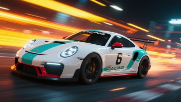 一辆白色为主、搭配蓝绿色条纹和红色细节的赛车,车身流线型设计,车头灯明亮,车身上有数字“6”和“RACING”字样,在不同的赛车场景背景中高速行驶,背景呈现出强烈的动感光效,有黄色、橙色的光线拖尾,营造出夜晚赛车的速度感和激情氛围,整体画面色彩对比鲜明,光影效果强烈,具有高度的视觉冲击力和真实的3D质感。