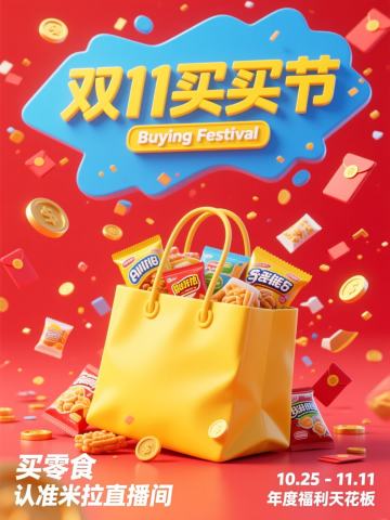3D浮雕大字搭配鎏金金属风,舞台红幕与缤纷零食堆叠,综艺感十足,喜庆奢华氛围烘托双11零食节盛典。