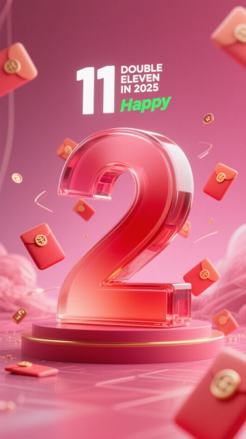3D充气风数字“2”主导画面,融合波普艺术色彩与重拟物质感,搭配卡通气球、礼盒营造喜庆促销氛围,双11囤货季倒计时主题鲜明。