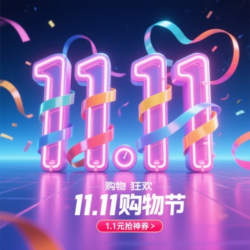 赛博朋克风3D数字“11.11”闪耀霓虹,玻璃质感与液态光影交织,未来感十足,箭头动态引导,营造酷炫梦幻的双十一购物狂欢节氛围。