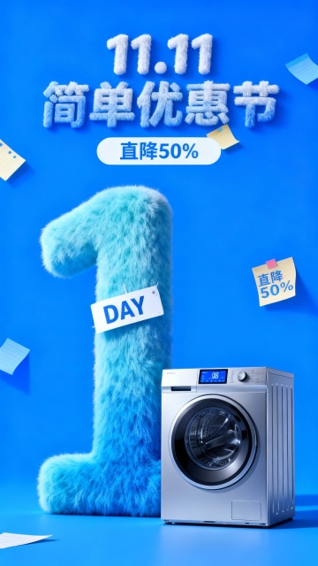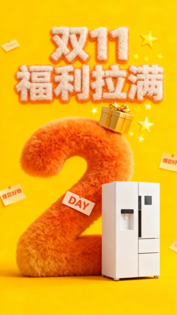 3D轻拟物风格,木雕质感台阶与浮雕文字营造温馨舒适氛围,柔和光影烘托双11家电焕新主题。