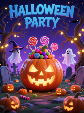 橙色软3D大字“不给糖!就捣蛋!”搭配南瓜与糖果,卡通风格浓郁,趣味十足,营造甜蜜又俏皮的万圣节氛围。