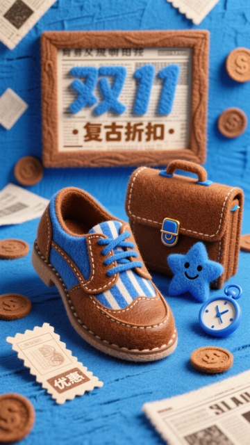 背景为棕色的木质纹理,搭配绿色的藤蔓与树叶,如同温馨的田园小屋。上方 “双 11” 字样是棕色的木质立体字,表面有自然的木纹,边缘缠绕着绿色的藤蔓。主体是一双棕绿配色的平底鞋,鞋面采用编织的棕色麻绳与绿色布料拼接,鞋头有绿色的小花装饰。旁边搭配着棕绿色的布艺手提包,包身有棕色的格纹,包带是绿色的麻绳。周围散落着棕色的卡通坚果币(币面有绿色的果蒂图案)、绿色的 “农场直供 折扣” 优惠券(带有棕色的麻绳捆边)、棕绿色的手工钱包,还有棕色爱心(爱心内部有绿色的树叶图案)、绿色笑脸、叶子形状的棕色星星等元素。整体采用质朴的 3D 卡通风格,营造出温暖、自然且充满田园气息的视觉效果