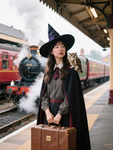 复古感的火车站,巫师装扮的女孩与猫头鹰相伴,梦幻故事感十足。
