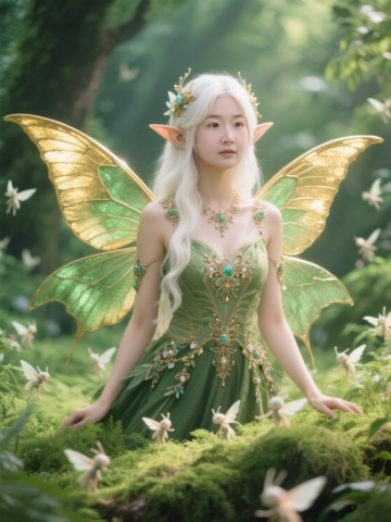 身着巫师袍,搭配短裙、白袜和黑鞋,留着金色长卷发,戴着黑框眼镜,手持魔杖;周围搭配白色猫头鹰、巫师帽、扫帚、复古木箱、书籍、油灯;背景是绿色做旧墙面