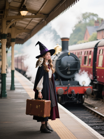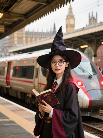 实景感与动漫风结合,少女身着巫师袍,手捧书本,站台背景增添梦幻故事感。