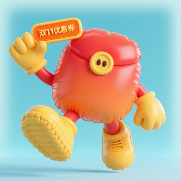 一个橙红色渐变的红包拟人卡通充气形象,它戴着黄色手套和鞋子,手举 “双 11 优惠券” 立体牌,造型活泼可爱,淡蓝色背景