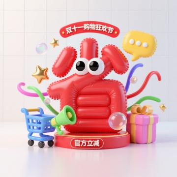 软3D风格的拟人化购物元素,萌趣十足,搭配鲜艳色彩与塑料质感,传递双11促销狂欢的可爱与趣味感。