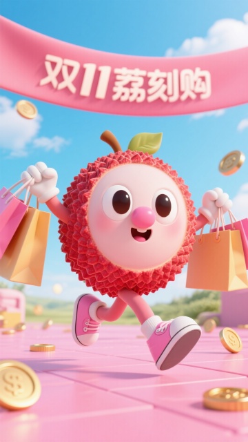 软3D风格的拟人化荔枝萌趣奔跑,手持购物袋,金币飞舞,充满可爱与卡通感,双11促销氛围浓厚,喜庆活泼。
