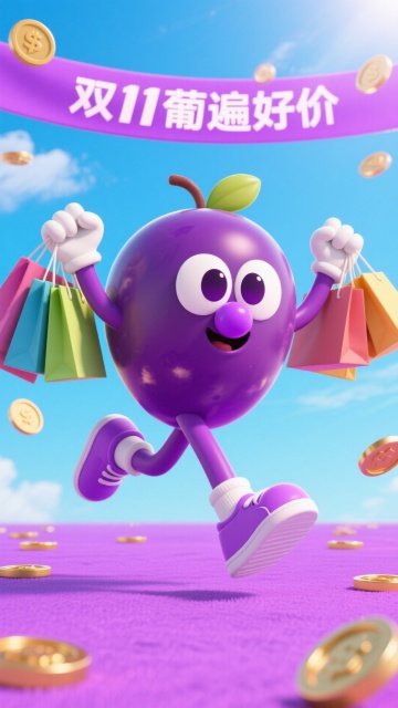 软3D风格的拟人葡萄角色,手持购物袋奔跑,充满卡通感与可爱感,背景金币飞舞,营造双11喜庆促销氛围。