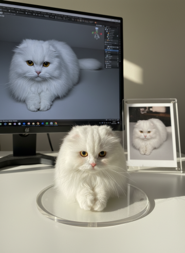 3D拟物风格,毛发生长细节逼真,虚实交融的实景感与柔和光影营造舒适氛围,虚拟现实与真实猫咪呼应,呈现科技与自然的和谐之美。