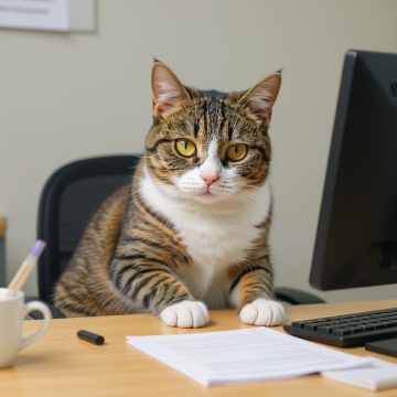 拟人风猫咪坐于办公桌前,重拟物风格呈现实景感,商务氛围中透出柔和舒适,印刷质感细节精致,尽显职场萌趣。