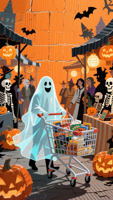 一位推着装满商品购物车、面带笑容的幽灵走到店铺里购买南瓜灯,充满活力与欢乐感,紫色背景