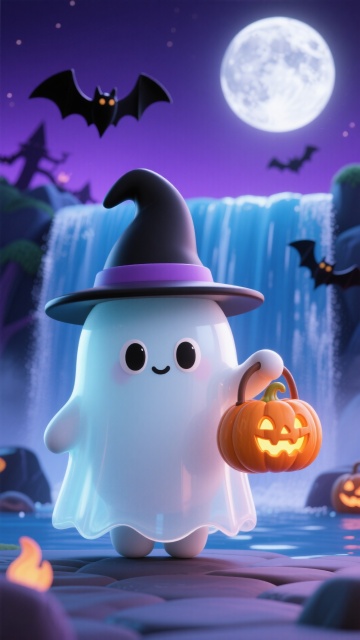 软3D风拟人小幽灵戴巫师帽坐南瓜灯上,梦幻月夜森林背景,可爱温馨趣味十足,塑料质感光影柔和,万圣节主题。