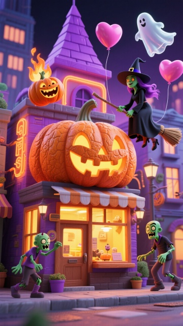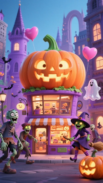 画面中有南瓜造型的店铺,周围环绕僵尸、女巫、幽灵、南瓜灯等元素,空中漂浮粉色爱心气球,背景是充满奇幻感的都市建筑,整体风格卡通梦幻,色彩以紫、橙为主
