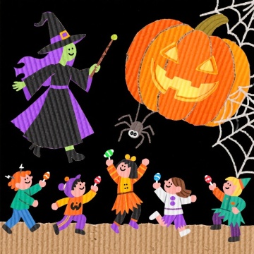 梦幻紫月夜下,巫师乘帚飞越南瓜灯与幽灵,哥特风插画融合厚涂与重拟物手法,营造神秘故事感,油画质感尽显万圣节氛围。