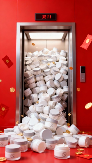 将画面中的主体提取到一个开门的电梯画面,主体重复的、拥挤的、密集且杂乱堆叠,堆满内部,从电梯中涌出到画面前方,电梯上方显示“双11”字样,上方飘落彩带和金币,点缀金币、红包,红色主色调