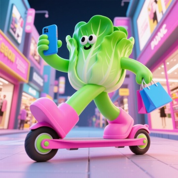 拟人化白菜骑粉色滑板车,手持手机与购物袋,穿梭于霓虹灯闪烁的潮流街区,融合3D风、卡通感与梦幻科技感,展现虚拟现实中的可爱时尚生活。