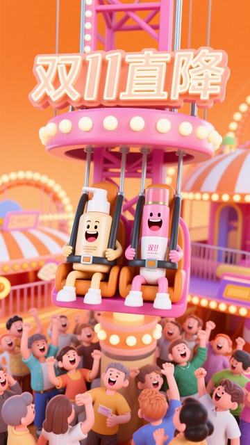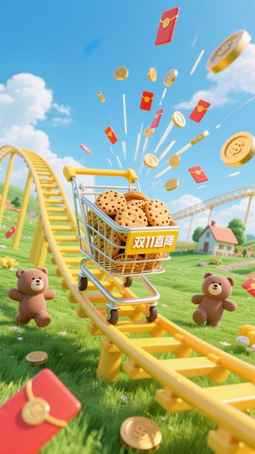 软3D风格的拟人化购物元素,萌趣十足,搭配鲜艳色彩与塑料质感,传递双11促销狂欢的可爱与趣味感。