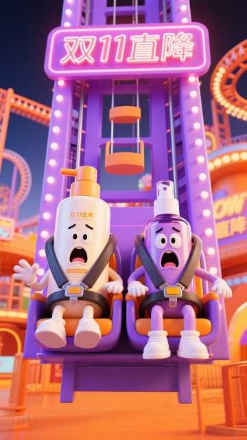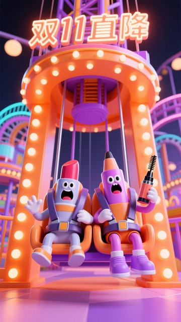 拟人化牛奶和拟人化面包坐在跳楼机的双人座椅上(有安全带),尖叫的表情,跳楼机顶部写着发光字体“双11直降”。背景是霓虹发光的游乐场,高饱和色调。海报主色调为橘色和粉色。