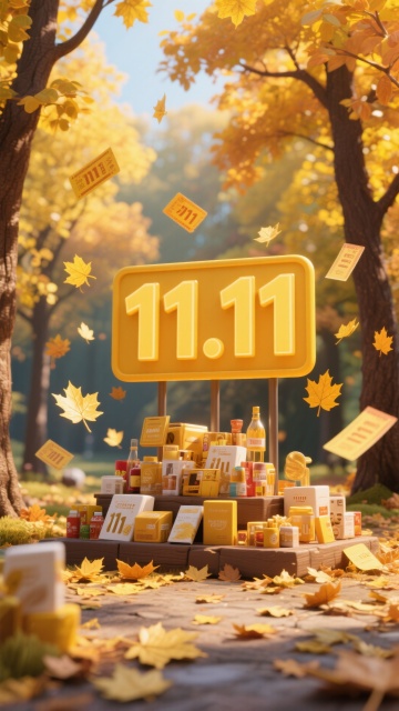 3D微缩艺术风秋日场景,金黄落叶纷飞,浮雕式“11.11”标志与商品堆叠,营造梦幻温馨的促销氛围,虚拟现实感十足。