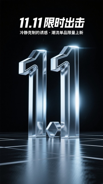 未来感科技风,霓虹蓝光映衬3D立体“11.11”悬浮标识,金属与玻璃质感融合,虚拟现实场景中列车停靠,光影交错强化体积感,营造沉浸式双十一大促氛围。