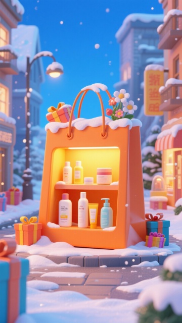 黄色购物袋,内部是服装店店铺(秋冬鞋服、包),暖黄灯光。购物袋顶部有覆着雪的礼盒、花朵。周围点缀礼盒,冬日雪景街道背景,蓝天