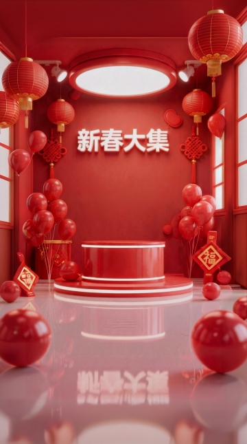 软3D国潮风,卡通人物与舞狮互动,喜庆红灯高挂,庙会入口热闹非凡,粘土质感细腻生动。