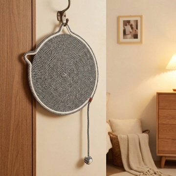 Interior rendering, cozy corner of a magic cat lounge, a round cat-bed sofa, soft woven texture, a small fish-shaped rug. Warm, gentle ambient lighting, a few floating golden magical sparkles. Limited color palette of cream, warm grey, and soft gold. Soft focus, vignette effect, intimate scene.