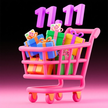 软3D风格购物车满载红包与礼盒,粉色“11.11”悬浮其上,搭配黄色流线背景,营造喜庆、促销、可爱又充满卡通感的双11节日氛围。