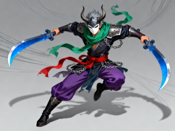酷炫感与卡通感交织,骷髅骑士骑乘蓝焰幽灵马,手持双剑,紫色披风飘扬,四周金币飞舞,插画风融合哥特风格与霓虹灯风,神秘而热血。