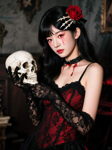 蒸汽波风与哥特元素融合,红黑配色搭配金属齿轮与链条,营造工业感十足的暗黑奇幻氛围,光影交错中透出神秘机能美学。