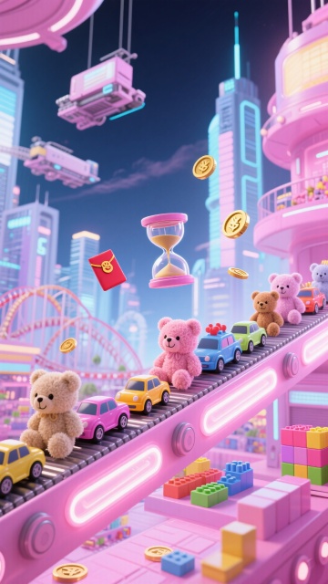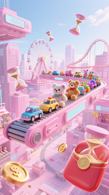 3D卡通风格,拟人猫咪驾驶复古车,波普艺术色彩,金币飞舞,秋日欢乐场景。