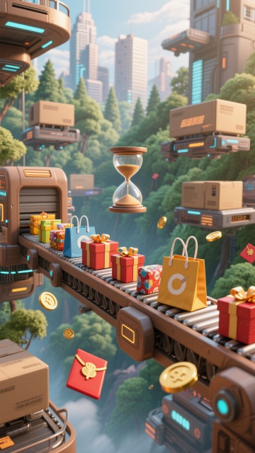 画面中心是悬空的传送带上的各类玩具商品。城市背景,未来科技感的空中物流,点缀悬浮小沙漏、红包、金币,游乐园背景,粉色色调