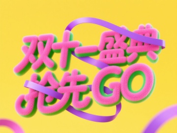 软3D毛绒字体搭配紫色丝带,充满甜蜜与可爱感,结合膨胀风设计,营造双11促销的欢快氛围。