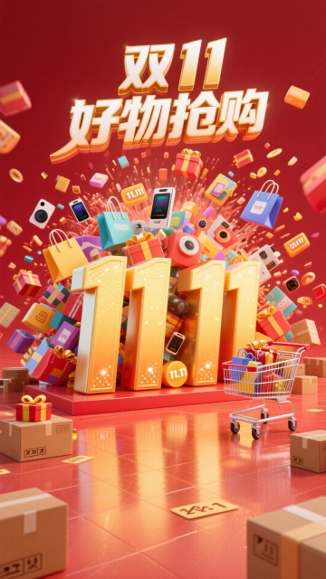 未来感与科技感融合的3D风格画面,工业风齿轮与霓虹灯元素交织,软3D人物手持数码设备,营造双11硬核购物季的机能风氛围。