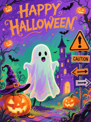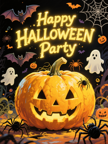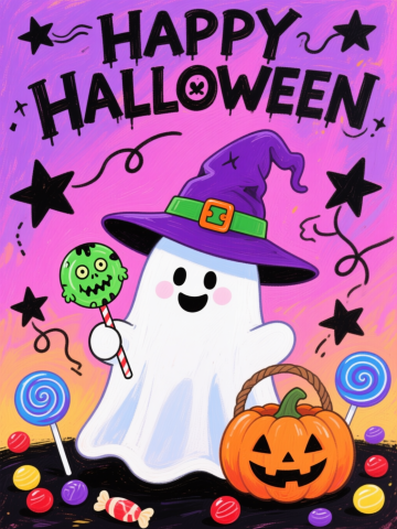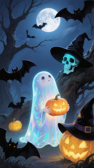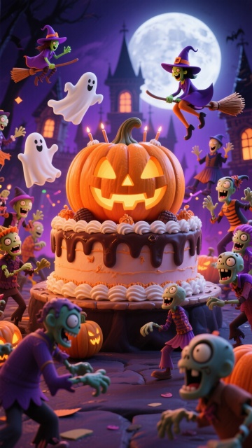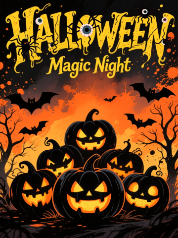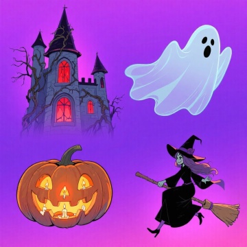 主体是巨型发光南瓜灯,周围环绕多个幽灵、女巫、小南瓜灯等元素,背景是紫粉色渐变的月夜,点缀蝙蝠和枯树,神秘氛围。