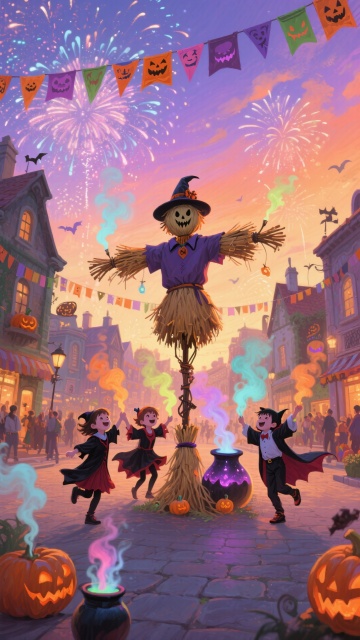 梦幻水彩插画风,拟人稻草人与童趣角色共庆万圣节,烟花粒子交织,超现实万圣节日氛围浓厚。