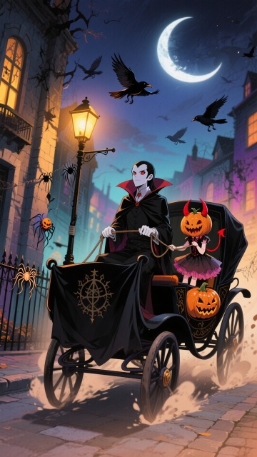 哥特风格与卡通感交融,吸血鬼与南瓜女孩驾马车夜行,神秘惊悚中透出故事感,插画风呈现万圣节奇幻氛围。